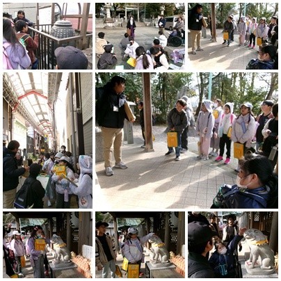 銀座通り商店街では、戦時中のお寺の鐘を見ました。この鐘は陶器でできています。戦時中はお寺の鐘も戦争の道具として差し出してしまっていたので、代わりに陶器で鐘をつくりました。深川神社では「頭が良くなるように」と、みんな狛犬の頭をなでました。