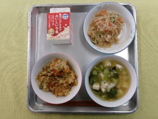 豚キムチごはん 牛乳 トックスープ 春雨サラダ です。