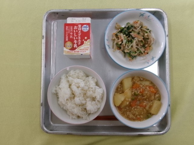 麦ごはん 牛乳 じゃがいものそぼろ煮 五色あえ です。