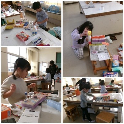 その日が今日やってきました。たくさんの空き箱を目の前に、一生懸命想像していました。さあ、何が完成するかな。