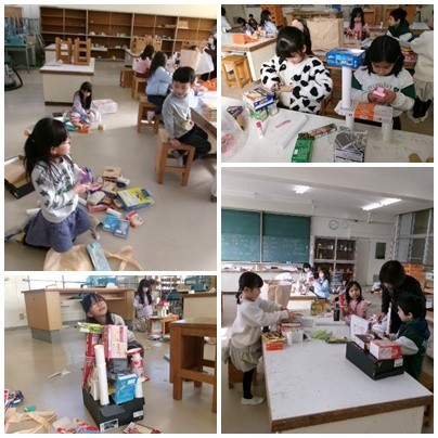 1年生は先週末ぐらいから空き箱をたくさん持ってきていました。図工で使うそうで、たくさんの箱から自分が想像した物を作るということです。