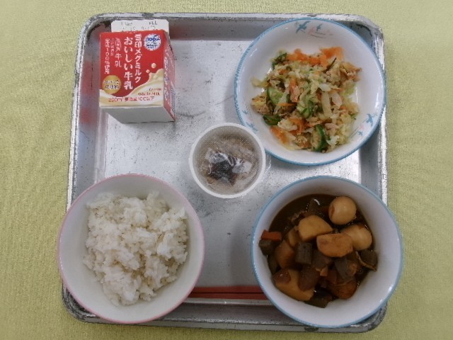 ごはん 牛乳 親子煮 ひじきと春雨のあえもの です。