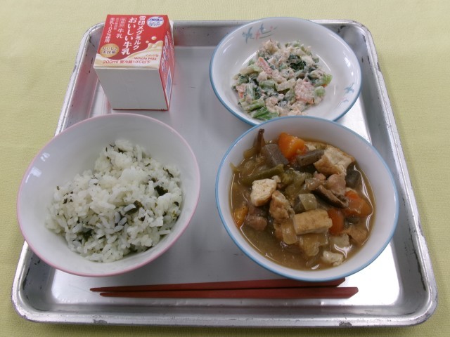 わかめごはん 牛乳 生揚げの吹き寄せ じゃがいもと小松菜のおかかあえ です。