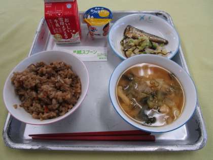 とりめし、牛乳、白みそ団子汁、いわしの梅煮、白菜の昆布和え、お月見ゼリー