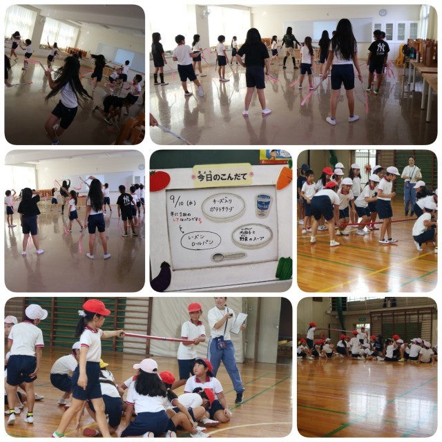 今日、3年生と4年生が体育で運動会の練習をしていました。3年生は体育館で台風の目の練習でした。みんな棒を上手にジャンプできたかな。4年生はダンスの練習です。今は振り付けを覚える段階です。映像や先生を指示を受けて振り付けを覚えていました。