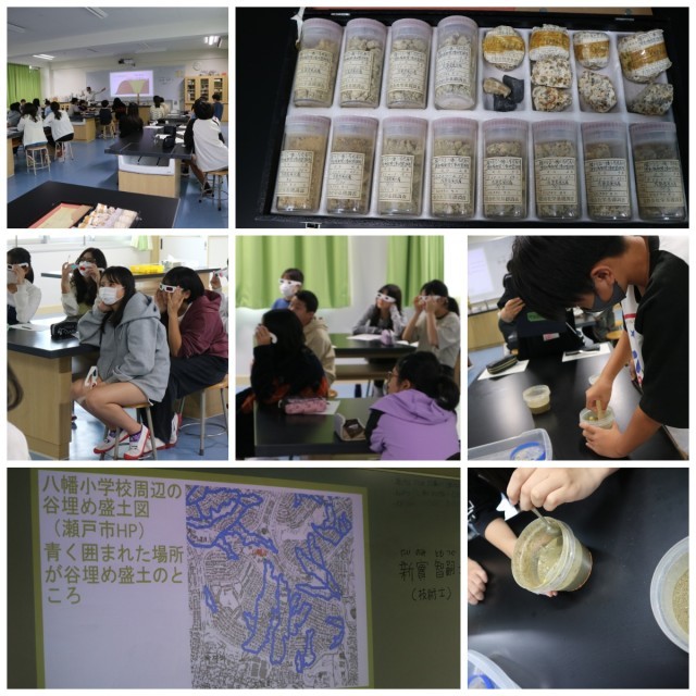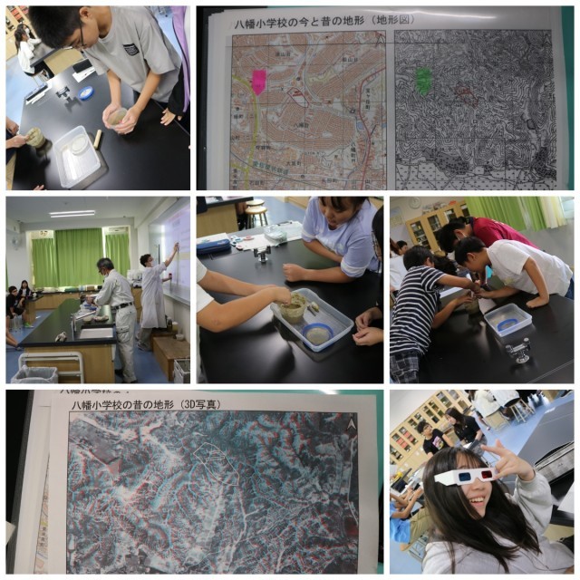 さて、今日は5・6年生が理科の出前授業を受けました。学校や自分の住んでいるところが山を削ったところなのか、谷を埋めて作ったところなのか、地図を見ながら確認していました。赤青のゴーグルを掛けると立体的に見られます。それで見ると、八幡台にあったところはなかなかに深い谷が幾筋もある場所だったことが分かりました。子どもたちは埋め立てた土地の地盤が弱いことや、液状化現象について実験をして確かめていました。