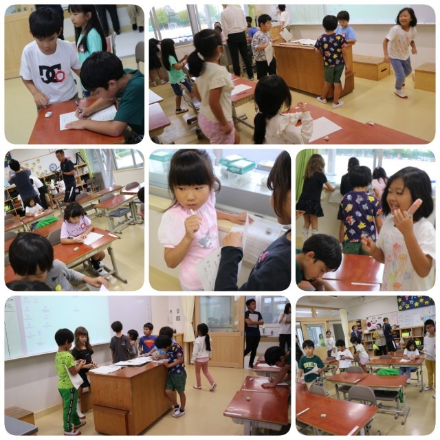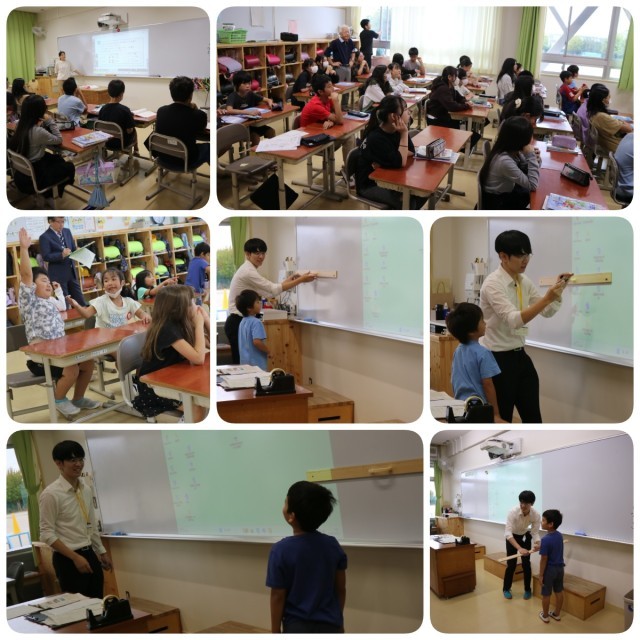 そして今日は教育実習生による研究授業でした。何かを測る際に、測るもと(基準)となるものを見つけるという授業でした。これが発展していくと、1cmとか1kgとかになるのですが、1年生の子どもたちは、自分の手や消しゴムなどを基準にして机の長さなどを測っていました。