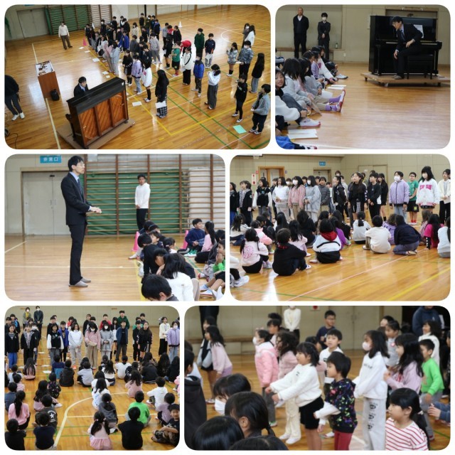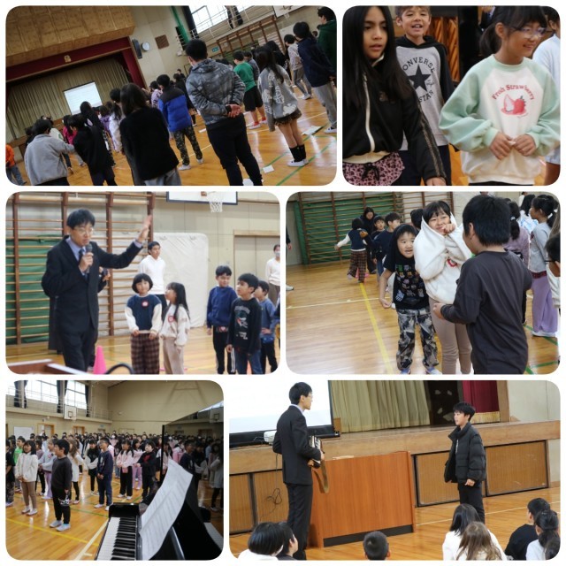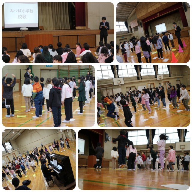 低学年はぴょんぴょん跳びはねながら歌っていましたし、高学年もスキップしながら歌っていました。松長先生からは、みつば小校歌は、ドラえもんのオープニング曲と似たようなリズム感という説明がありました。これもドラえもんのオープニング曲と校歌を交互に演奏しながら説明してくれたので、子どもたちもより校歌に親近感を持つことができました。