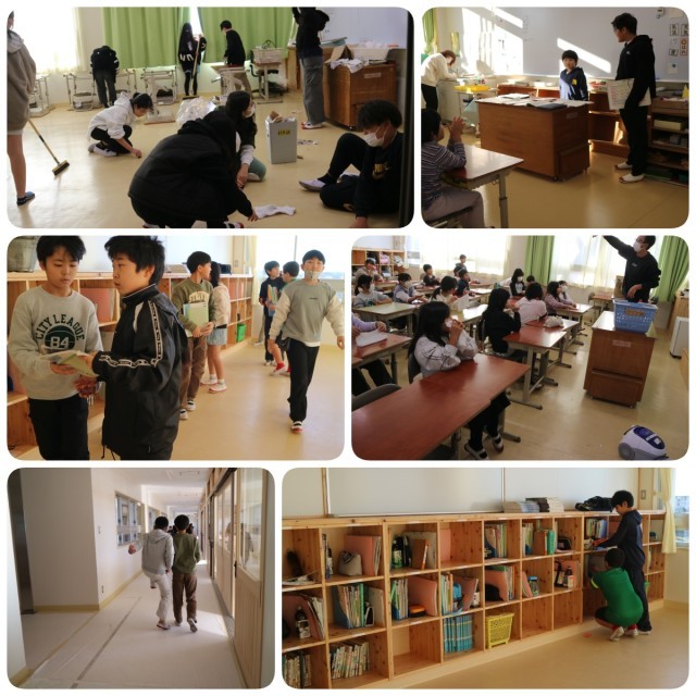さて、3学期から新しい教室で授業することを見越して、今日は1年生を除いてお引っ越しでした。2年生が2階へ、4~6年生は3階へ移動します。3年生は平行移動ですが、これまで使っていた教室ではない教室へ移動します。朝、自分たちの荷物を運び、5時間目は机・いすの移動に加え、これまで使っていた教室を掃除しました。