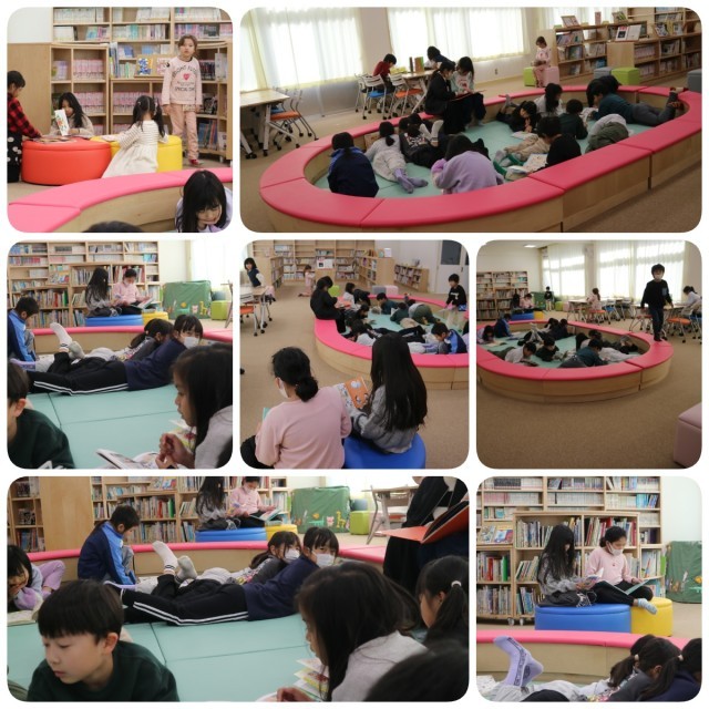 そして、先週ついに図書室が開館しました。なかなか写真を撮りに行けなかったのですが、今日やっと写真を撮ることができました。1~3年生の子が多くいましたが、みんな思い思いの場所に座ったり寝転んだりしながら本を読んでくれていました。1年生はお菓子がたくさん載った本を持ってきて、何人かでどれが食べたいか指さしをしていました。複数人で一つの本を読んだり、一人でじっくり読んだりと思い思いに過ごす場所になっていました。今後も利用者が増えることを期待しています。