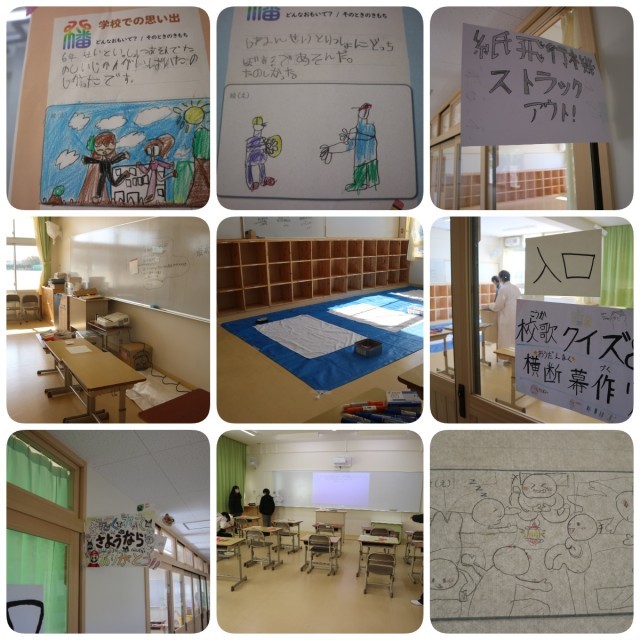 今日も日は照っていますが冷たい風の吹く日となりました。さて、学校では、明日開かれる送る会&閉校行事&感謝の会に向けて準備が佳境に入っています。写真には各ブースの看板を掲載しました。担当の先生たちと最終的な打合せを行っているブースもありました。入念に準備をしている様子が見られます。また、写真にはないですが、当日はPTAもブースを出します。また、お土産に缶バッジを配布する予定です。是非お越しいただきお土産ももらっていっていただけると嬉しいです。
