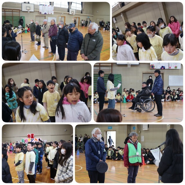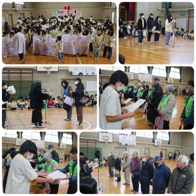 午後の部は、地域のボランティアの方々をお招きして、感謝の会を行いました。図書ボランティア、登下校の見守りボランティア、まるはち会の方々、クラブ活動でグラウンドゴルフを指導してくださるさくら会の方々、交通指導員さん、みんなを守る会の代表の方に感謝状を渡しました。