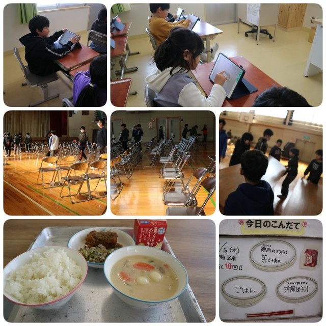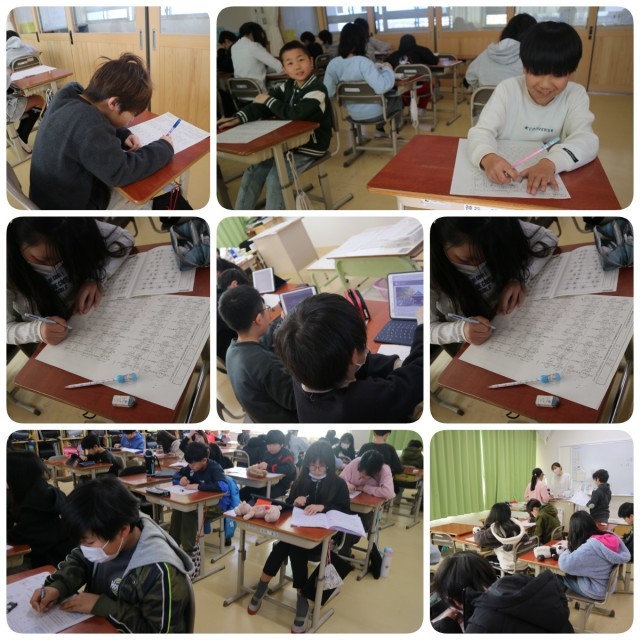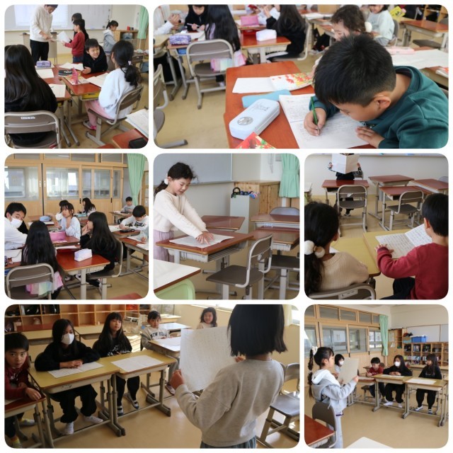 2年生は1年間の思い出についての発表のため、作文用紙に発表原稿を書いていました。早く書けてしまった子は隣の教室で発表練習をしていました。急いで読まないことや時々聞いている人の方に目を向けることや、声の大きさに強弱を付けることなどをお互いに意見しながらよりよい発表になるよう工夫していました。そうした工夫を自分たちで考えられるのはすごいことですね。