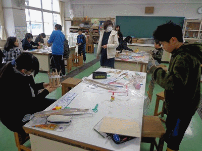 竹のような紙で、黙々とかごを編んでいます。出来上がりが楽しみです。