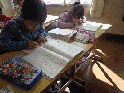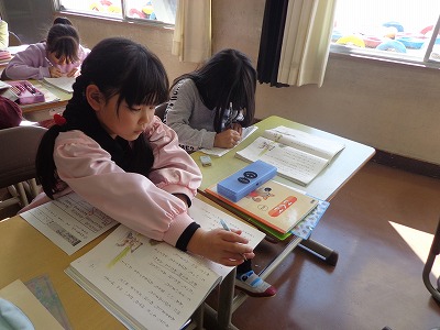 教科書を読んで「おばあさんがしたこと」を見つけて、シートに書き出します。後でみんなで確かめます。
