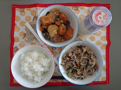 献立は、関東煮、ひじきと春雨のあえ物、ごはん、牛乳、ココア牛乳のもとです。今日もおいしくいただきました。
