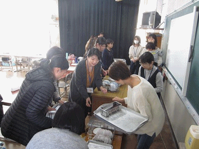 1年生保護者の親睦会を兼ねて行いました。2年生以上の保護者も含め、多くの方に参加していただきました。学校栄養職員が給食や栄養、おやつなどについて話した後、参加した方に配膳していただきました。「子どもたちは、毎日やっているんですよね〜」などと実感されていました。