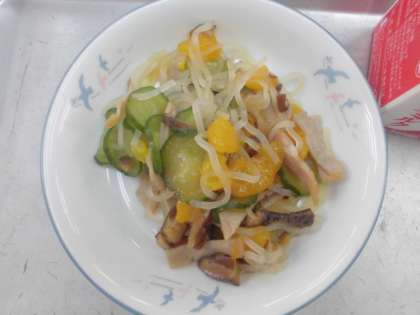 ハム、きゅうり、しいたけ、みかん、はるさめ、さとう、あぶら、ごまあぶらで、つくられています。