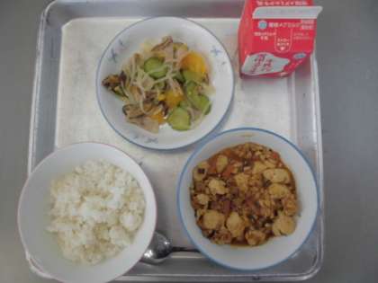 マーボー豆腐(とうふ)、麦(むぎ)ごはん、中華(ちゅうか)あえ、牛乳(ぎゅうにゅう)。