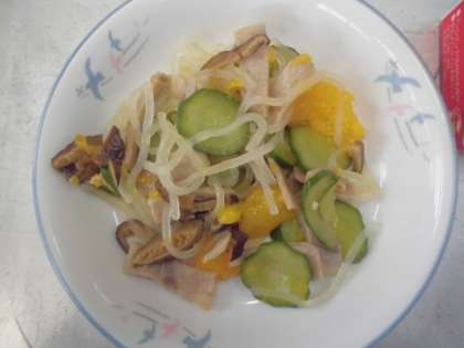 中華あえの色合(いろあ)いがきれいです。やはり、みかんかんづめのオレンジが鮮(あざ)やかです。