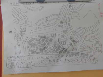 八幡小学校(はちまんしょうがっこう)のまわりの絵地図(えちず)をもとに、学習(がくしゅう)していました。