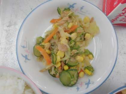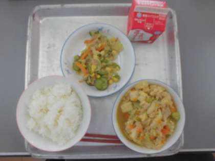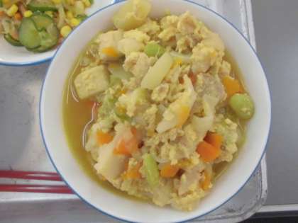 ごはん 牛乳(ぎゅうにゅう) こおりどうふの卵(たまご)とじ キャベツとツナのあえもの。