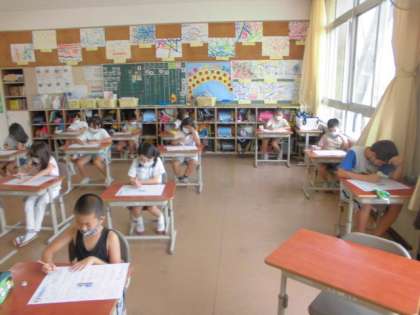 国語(こくご)のテスト中(中)、教室(きょうしつ)は、静(しず)まりかえっていました。
