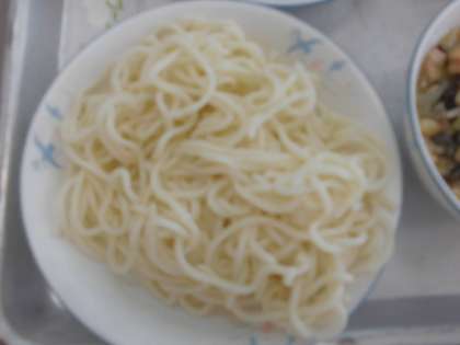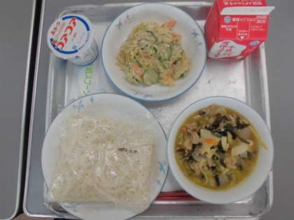 ソフトめん 牛乳(ぎゅうにゅう) 中華(ちゅうか)あんけけ バンバンジーサラダ ヨーグルト。