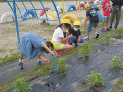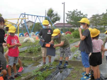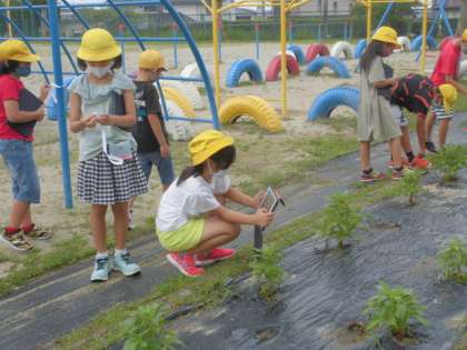 植物(しょくぶつ)の観察(かんさつ)をしていました。テープで長(なが)さをはかったり、タブレットで写真(しゃしん)をとったりしていました。