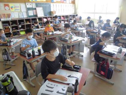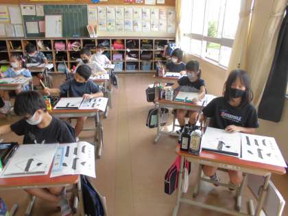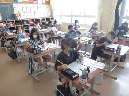 みんな真剣(しんけん)です。ピンと張(は)り詰(つ)めた空気(くうき)の中(なか)、筆(ふで)をすすめていました。