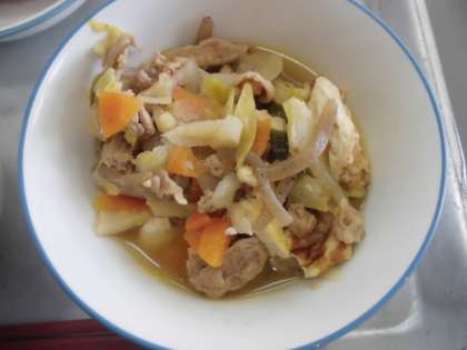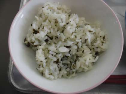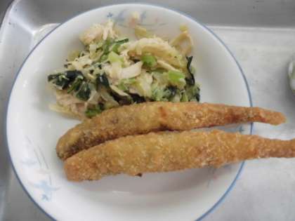 わかめごはん 牛乳 すき煮 子持ちししゃもフライ キャベツとささみのあえもの。