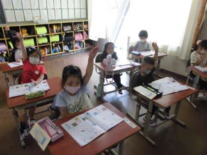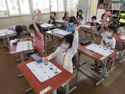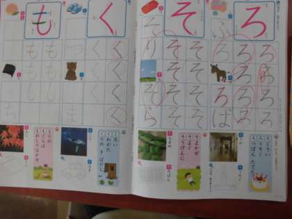 ひらがなの練習。発言のルールを守って、しっかり挙手ができていました。