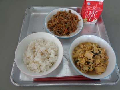 今日の給食は、麦ごはん、牛乳、凍り豆腐の卵とじ、きんぴらごぼうです。