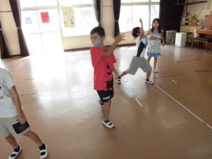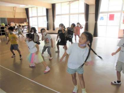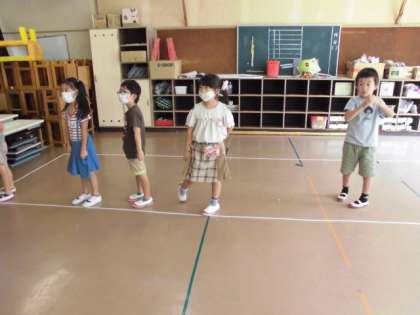外の体育は中止し、エアコンのあるプレイルームで、リズム運動をしました。