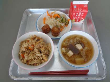 今日の給食は、ツナの炊き込みごはん、牛乳、じゃがいもののっぺい汁、ごぼう入りつくね、切干大根の甘酢あえです。