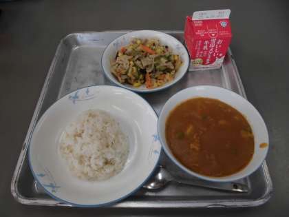 今日の給食は、麦ごはん、牛乳、ハヤシシチュー、いろどりサラダです。