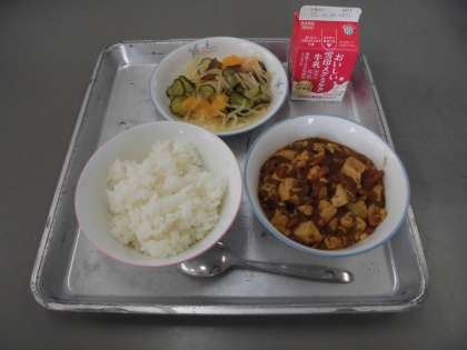 今日の給食は、ごはん、牛乳、マーボー豆腐、中華あえです。