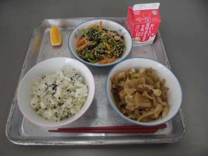 今日の給食は、わかめごはん、牛乳、大根のそぼろ煮、小松菜のごまあえ、オレンジです。