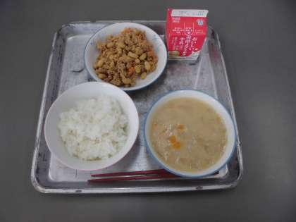 今日の給食は、ごはん、牛乳、洋風団子汁、ツナのあまからにです。