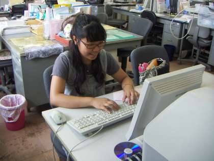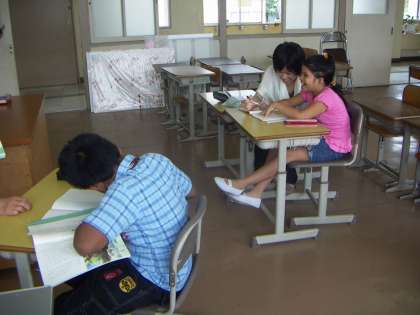 今日は、県立大学ボランティア先生が来校されました。写真上は、日本語教室で補助をしていただいている古舘美南先生です。写真下は、保護者向け連絡プリント翻訳中の水越ジェマディー先生です。