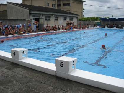 授業で行う水泳が、今日と明日の2日間となりました。最終日の学年は泳力の検定等を行っています。写真は、2年2組(写真上)、2年1組と3年生(写真中)、5年生(写真下)の泳力検定中の様子です。プールサイドの子どもたちが声援を送っています。