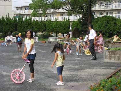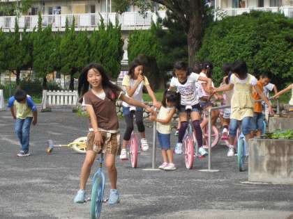 朝の授業前の時間は、子どもたちが競って一輪車の練習をしています。写真は、教頭先生と特訓中の子どもたちの様子です。
