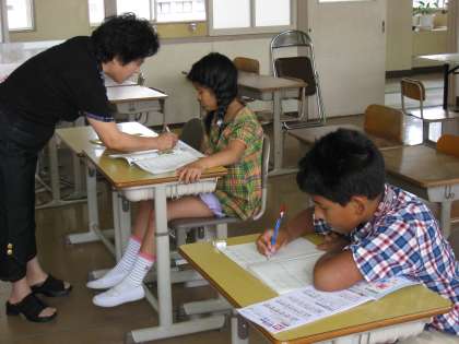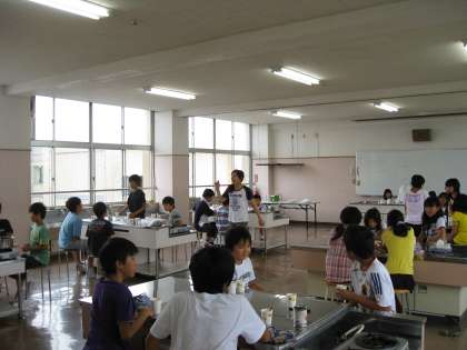 写真は、2年3組の音楽「グループ合奏の発表」、6年2組の家庭「フルーツ寒天ポンチづくり」、日本語教室の様子です。