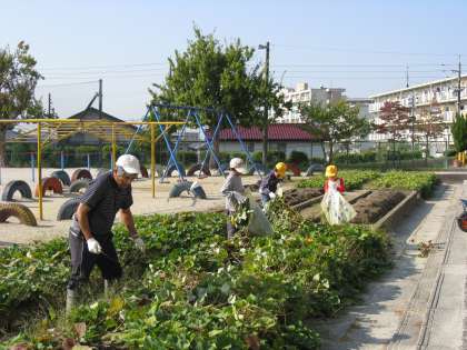 たんぽぽ組が、サツマイモ収穫の準備作業を行いました。涼しい風はふいていますが、まだまだ日ざしが強い中での作業となりました。収穫後の調理実習がとても楽しみです。