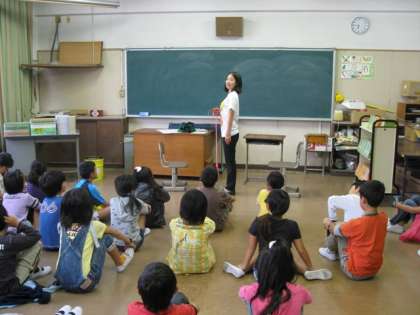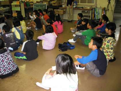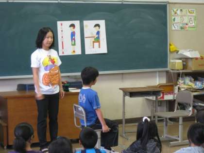 今日は、実習生の稲垣先生が、4年1組で「良い姿勢」についての授業を行いました。稲垣先生のTシャツには内蔵と背骨の絵が描かれていて、お腹の中と背骨の様子がよく分かりました(写真上・中)。お話を聞いている子どもたちの姿勢もとても良かったです(写真下)。