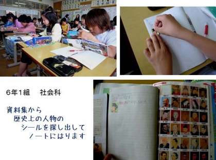 児童が使用する「社会科資料集」の巻末には歴史上の人物の肖像画シールがあります。児童が調べ学習などをすすめていく中でノートやワークシートにはりつけ、歴史上の人物のプロフィールなどを視覚からも理解します。