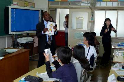 ブライト先生は電子黒板(大型テレビのモニター)を活用してテキストを提示されました。モニター画面を専用のペンでタッチすると、テキストのページがめくられたり、音が出たり、説明が出たりします・・・(写真 下)