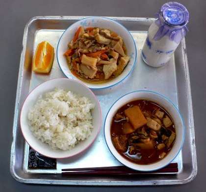 今日のメニューは、みそ汁、豚肉と筍(たけのこ)の炒め物、麦ご飯、ひじき海苔、牛乳、オレンジです。(写真 上)