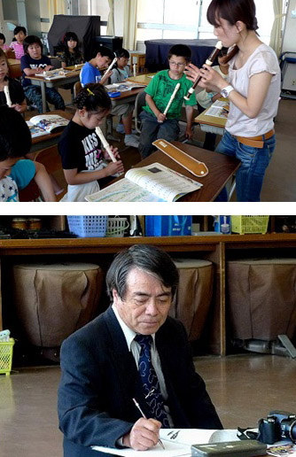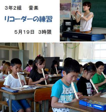 5月19日(木)の3時間目に音楽室へお邪魔すると洞口教諭が音楽の授業でリコーダー演奏の指導中でした。そして教室の後方には指導教員の加藤先生が授業を観察していました。