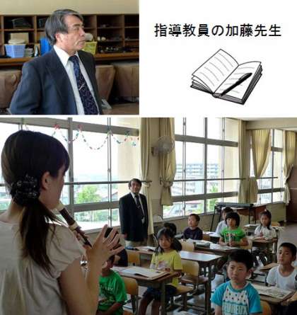 毎週1回、「拠点校指導教員」(ちょっと難しい名前ですね。以下 指導教員)が来校して初任者を対象に指導にあたります。本校の指導教員は加藤先生(写真 3)で、毎週木曜日に来校されます。加藤先生は瀬戸市内の小学校の校長を歴任し、定年退職後はこうして指導教員として後進の育成に尽力されてみえます。